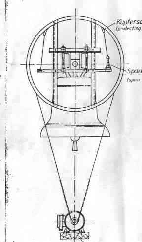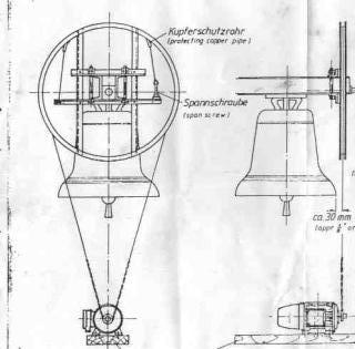 Hier sehen Sie eine gezeichnete Glocke mit einem angebauten Seilrad.  Die Schwierigkeit dabei ist, das Rad genau zentrisch zum Mittelpunkt der Drehachse vom Holzjoch zu montieren. Die Verbindung zwischen Kette und Motor, die zum Motor führt, wird Unterzug genannt.
