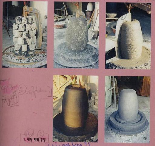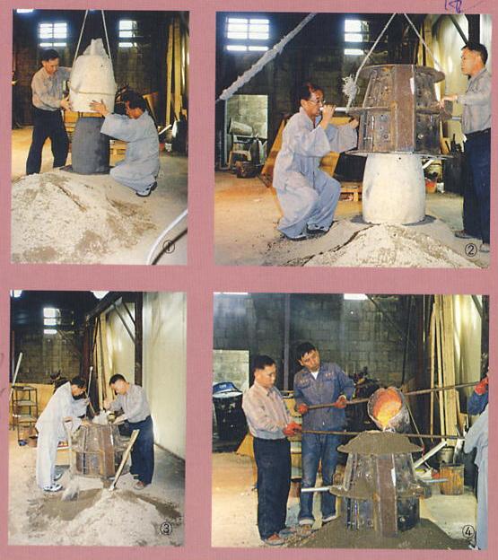 Auch hier wird zuerst ein Ziegelkern gemauert und in mehreren Lehmschichten eine Hohlform geschaffen, in das dann das flüssige Erz eingegossen wird. Es handelt sich dabei ebenso wie bei den deutschen Glocken um die legendäre Zinn-Bronze (Glockenbronze). Unten sehen Sie das Aufsetzen von Mantel und Klammer mit dem Gießakt.