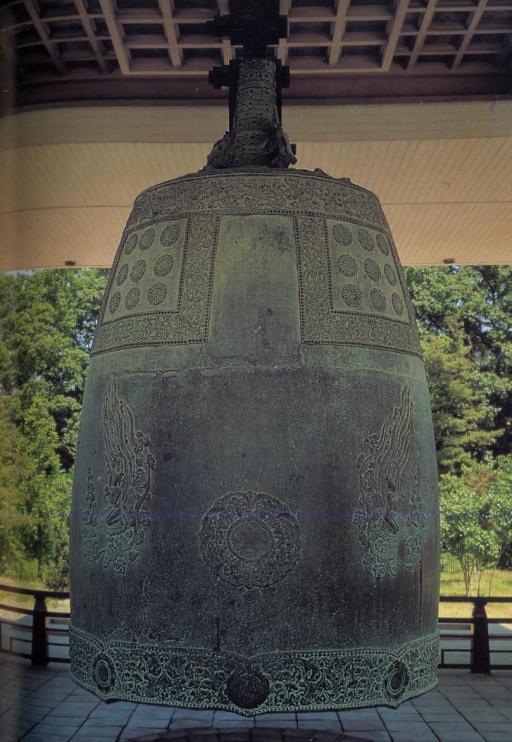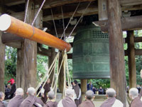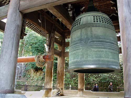 Die meisten größeren Tempel besitzen auch eine Glocke aus Bronze, die an einem frei stehenden, überdachten Gerüst aufgehängt ist. Das Bild unten zeigt die größte Tempelglocke Japans im Tempel Chion-in in Kyoto, dem Haupttempel. Sie wiegt ca. 70 Tonnen, ist 3,3m hoch und hat einen Durchmesser von 2,8m . Die Wandsträrke liegt bei 300mm. Angeschlagen werden diese Tempelglocken von einem seitwärts gelagertem Hartholz, der sich nur in der Horizontalen bewegen läßt. Der Klang ist ähnlich einer Kirchenglocke, jedoch geprägt von einem eher gongartigem Charakter ohne einem akordartigem inneren Teiltonaufbau, da die Wandungsstärke durchgehend einheitlich ist.