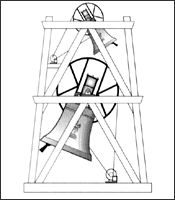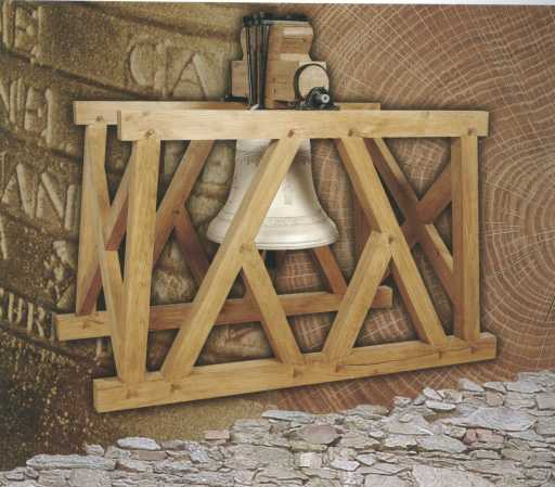 Beispiel für korrekt verzimmerten Glockenstuhl mit Tetraederstatik und richtig platzierten Läutemotoren.